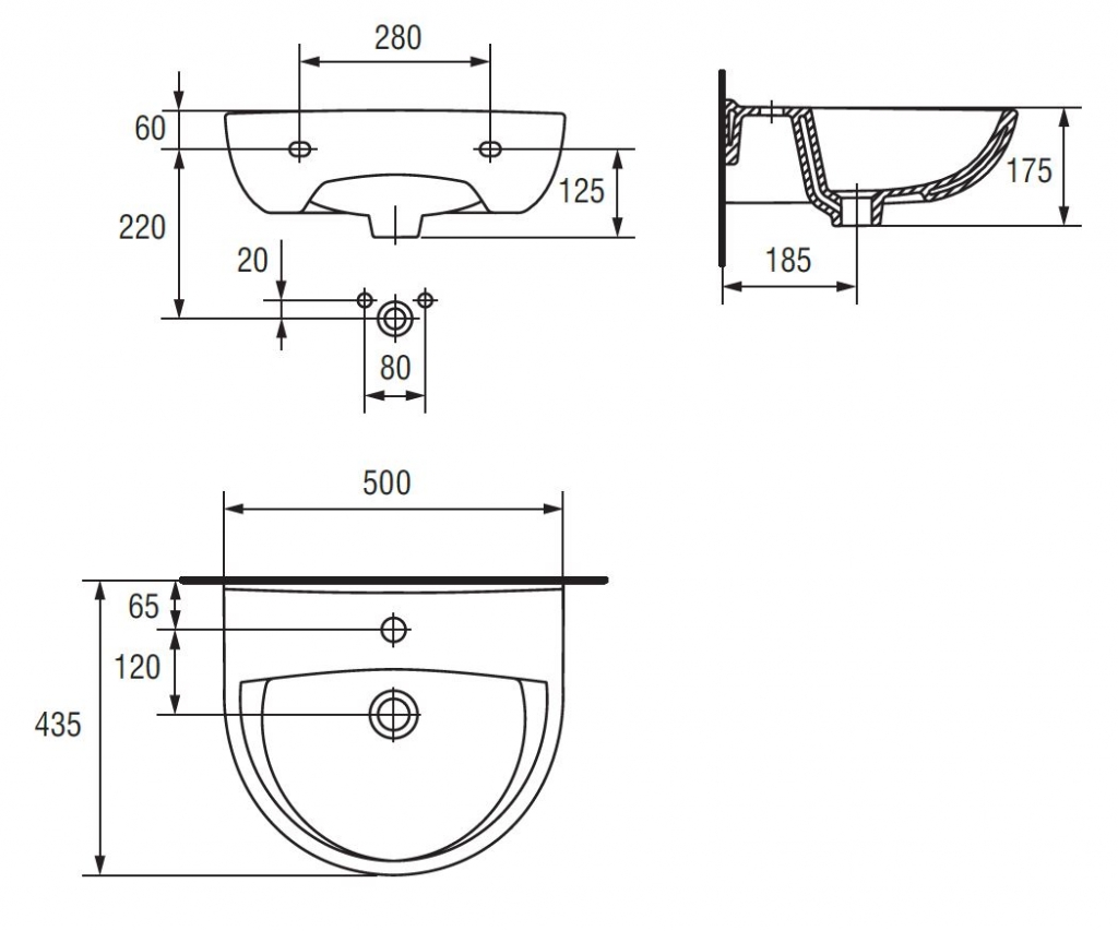 Závěsné umyvadlo PRESIDENT s otvorem pro armaturu. Možnost montáže s ozdobným sifonem, s polosloupem nebo sloupem.
