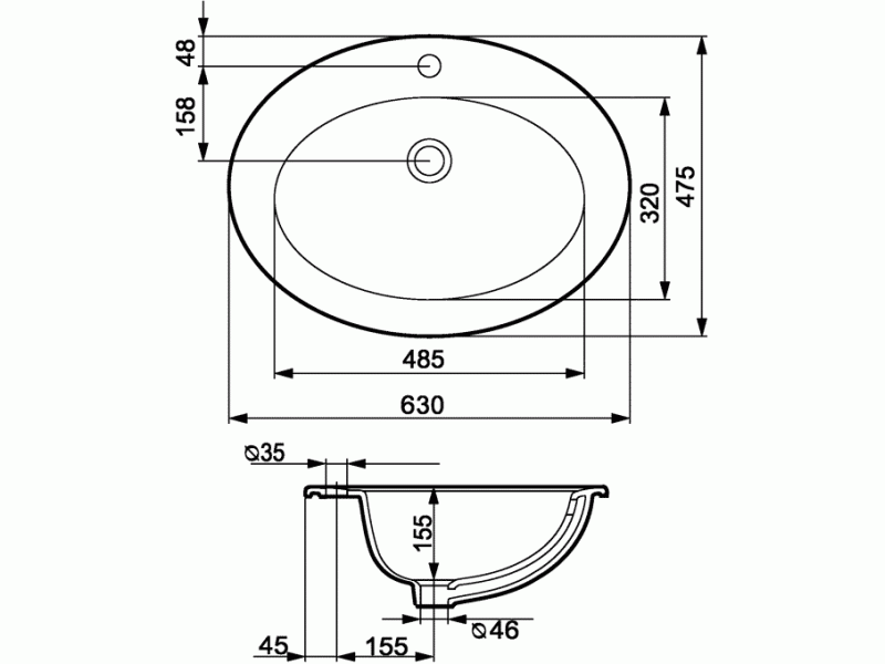 Zápustné umyvadlo GAMMA 60 bílé barvy s přepadem a otvorem pro armaturu. Možnost montáže na desku nebo se skříňkou.