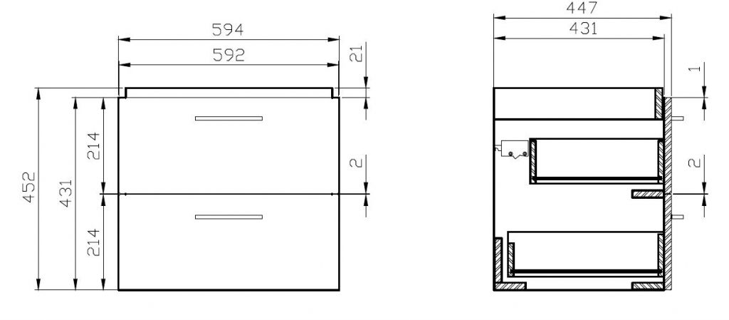 Závěsná skříňka s dvěma šuplíky se systémem měkkého dovírání, je doplněna chromovými madly.