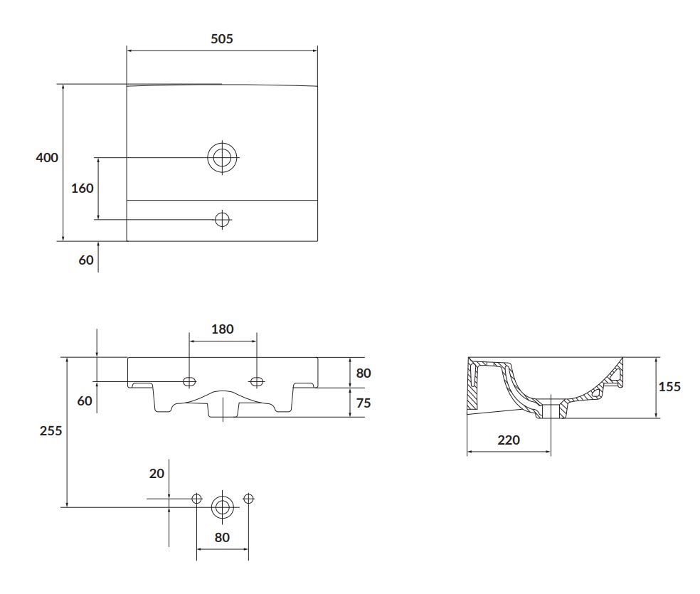 Součástí umyvadla není baterie ani výpust.