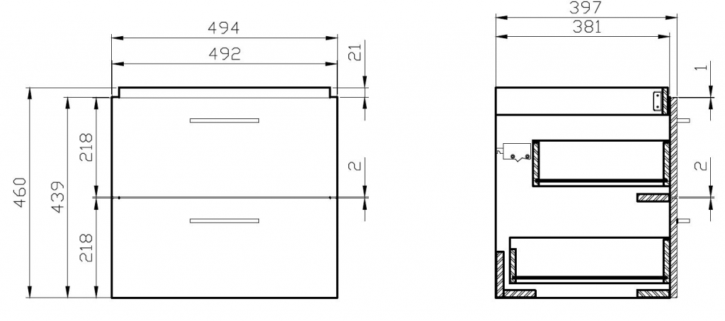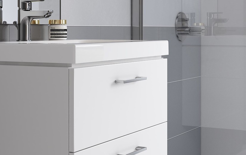 Závěsná skříňka v lesklém provedení s dvěma šuplíky se systémem měkkého dovírání, je doplněna chromovými madly, dodávaná včetně keramického umyvadla.
