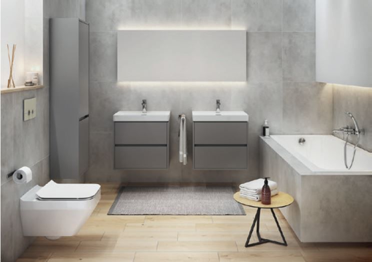 Součástí sestavy je závěsná myvadlová skříňka CREA 50 s nábytkovým umyvadlem CREA 50. Čelo a korpus skříňky jsou vyrobeny z vlhkovzdorné šedé dřevotřísky. Skříňka je vybavena dvěma prostornými zásuvkami. Šedá struktura lnu dodává skříni další elegantní vzhled. Umyvadlo CREA je vyrobeno z keramické hmoty ROCKLITE, díky čemuž je překvapivě odolné, lehké a s extrémně tenkými stěnami.