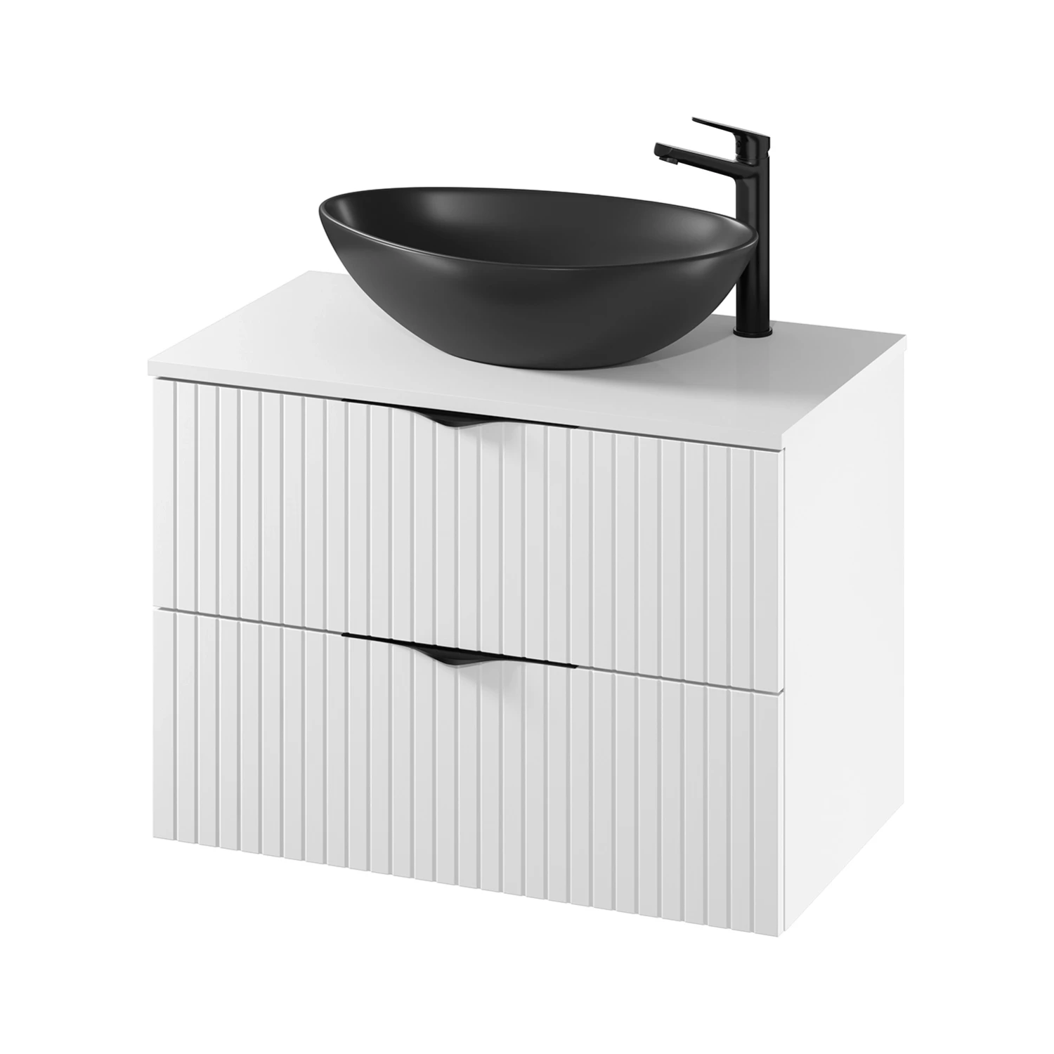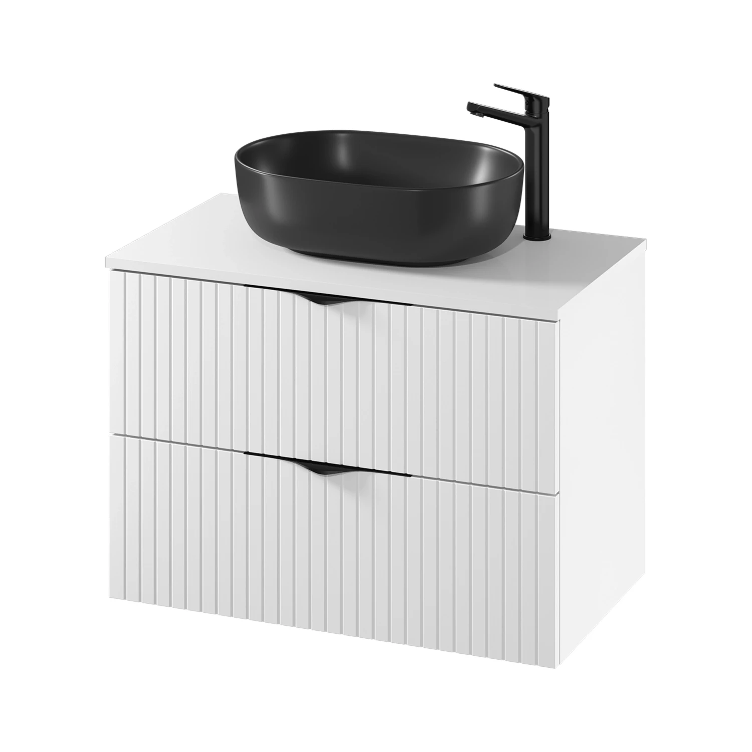 Závěsná umyvadlová skříňka TIRSO pro umístění pod desku stejné série. Vyrobená je z 16 mm dřevotřískové desky, je vybavená dvěma prostornými zásuvkami se systémem tichého dovírání. Přední čela šuplíků jsou frézovaná a doplnit skříňku můžete ocelovými úchytkami, které jsou dodávané v barevném provedení chrom a černá mat.