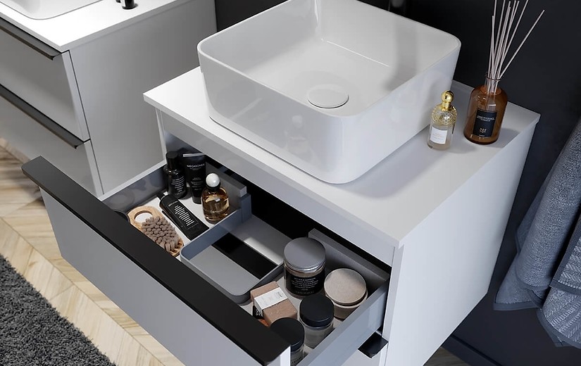 Koupelnový nábytek z kolekce VIRGO concept je kombinací funkčnosti, elegance a modernosti. Skříně této řady mají černé, matné, kovové úchyty, které budou perfektně ladit se zbytkem vašeho koupelnového vybavení. Pod umyvadlové skříňky VIRGO jsou vyrobeny z dřevotřískové desky z šedého dubu (čela), s matnou povrchovou úpravou po stranách korby. Dvě praktické zásuvky jsou vybaveny systémem „soft-close“. Uvnitř horní zásuvky je výřez pro sifon s krytem. Spodní část zásuvek je pokryta jemnou strukturou šedého lnu. Nábytek se prodává smontovaný.
