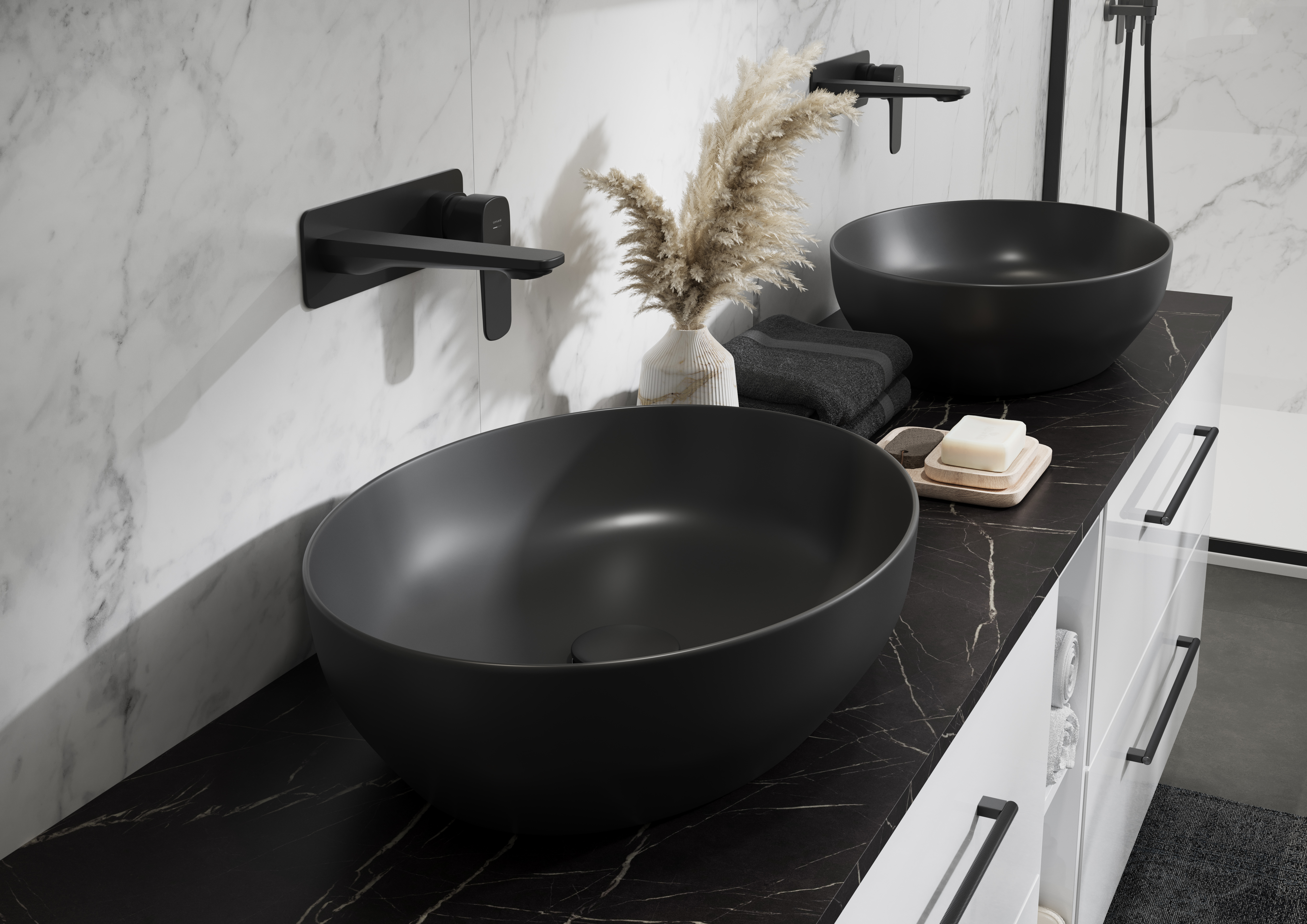 Vrchní dřevotřísková deska marmor/ černá odolná proti vlhkosti je určená k nábytku série LARGA.