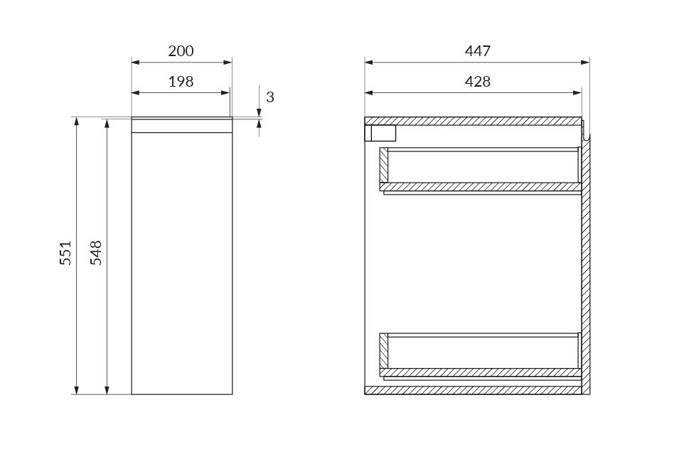 Úzká skříňka po celé délce je ideální pro uložení vysokých lahví s tekutinami a dalších nezbytností. Tenké kovové bočnice zásuvek v antracitové barvě dodávají elegantní a moderní nádech.