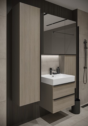 Koupelnový nábytek z kolekce VIRGO concept je kombinací funkčnosti, elegance a modernosti. Skříně této řady mají chromovaná kovová madla, která budou perfektně ladit se zbytkem vašeho koupelnového vybavení. Závěsné skříně VIRGO jsou vyrobeny z dřevotřísky s boky korpusu v barvě šedého dubu. Nábytková dvířka jsou vybavena praktickým zrcadlem a panty se systémem „soft-close“. Uvnitř skříněk jsou 3 police z kouřového tvrzeného skla a povrch zadní části skříně je pokryt jemnou šedou lněnou strukturou. Nábytek se prodává smontovaný.